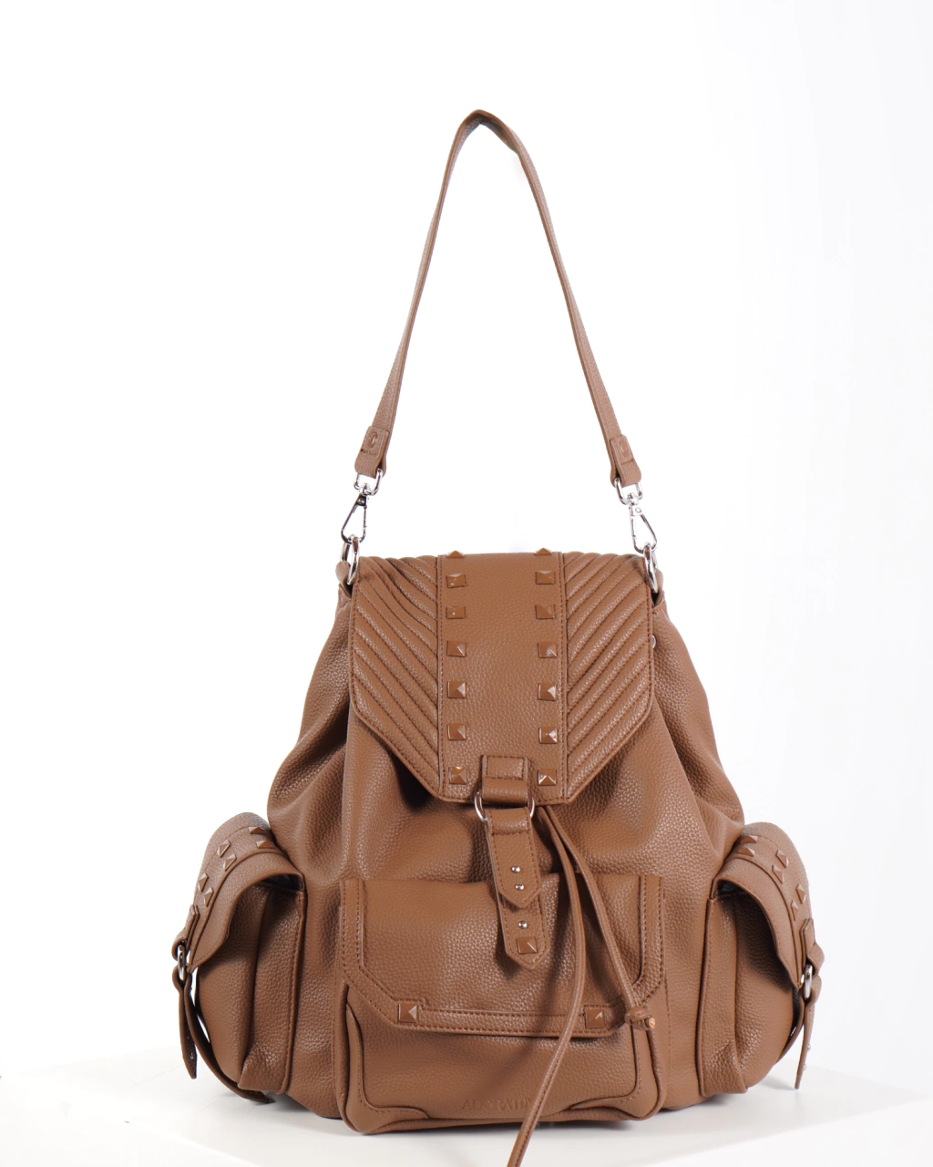 El detalle de tachas a tono le aporta un toque distintivo y sofisticado, haciendo de esta mochila un complemento ideal para cualquier ocasión.